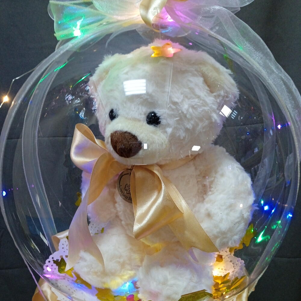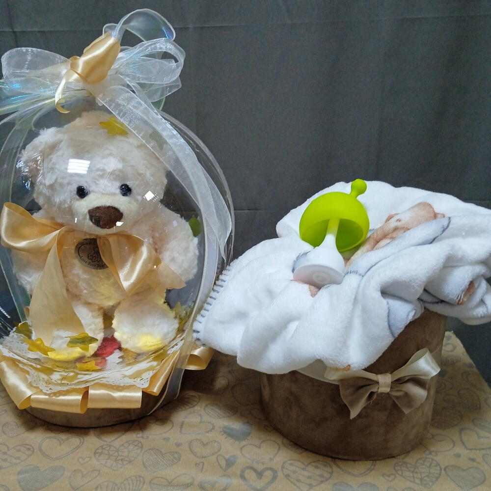 Мягкий плед Погремушка-грызунок Полимерный шар баблс Мягкая игрушка медведь Коробка круглая Светодиодная гирлянда на батарейках Лента атласная