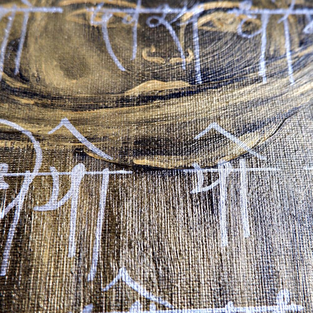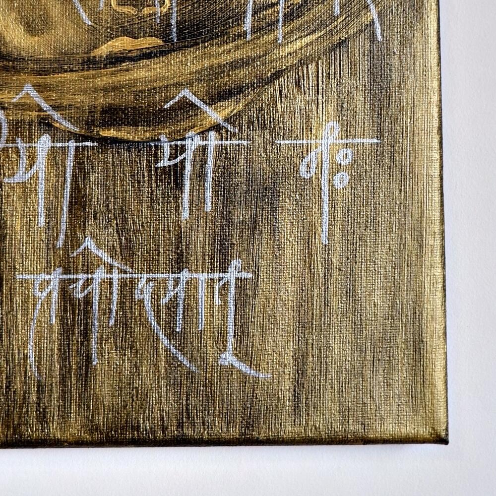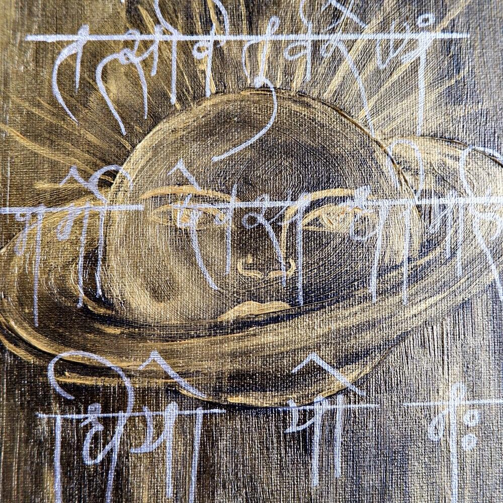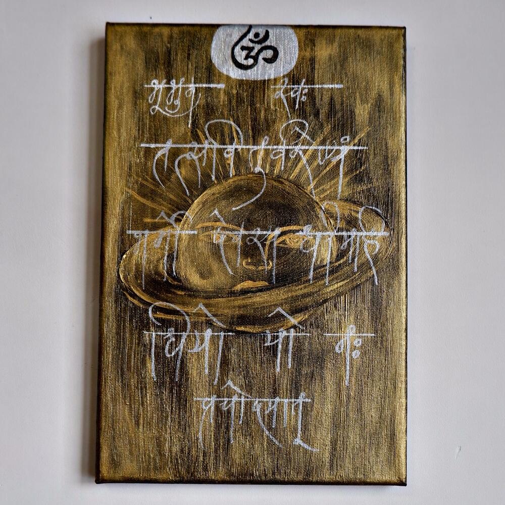 “Мантра Исцеления” – картина, соединяющая энергию Вселенной и сакрального слова. В центре – планета, напоминающая Солнце или Сатурн, символизирующая бесконечность, циклы времени и трансформацию. Золотой фон отражает поток божественного света, а мантра, нанесённая поверх изображения, усиливает её вибрацию, привнося в пространство гармонию и глубинное исцеление. Эта работа станет мощным энергетическим объектом для медитаций и наполнит дом сакральным смыслом.