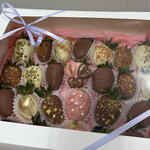 свежая клубника, бельгийский шоколад Callebaut (какао-масло, тёртое какао, сахар, сухое молоко, соевый лецитин, ваниль), пищевой жирорастворимый краситель,дроблёные фисташки, вафельные крошки, съедобные шарики и пищевой перламутровый кондурин.