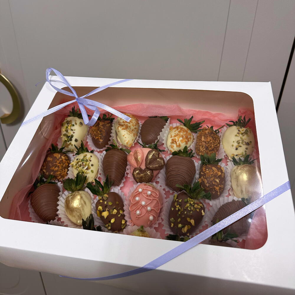 25 крупных сочных ягод, покрытых премиальным шоколадом Callebaut. Ручное украшение фисташками и лёгким блеском кондурина делает набор идеальным для подарка и праздничного стола.
