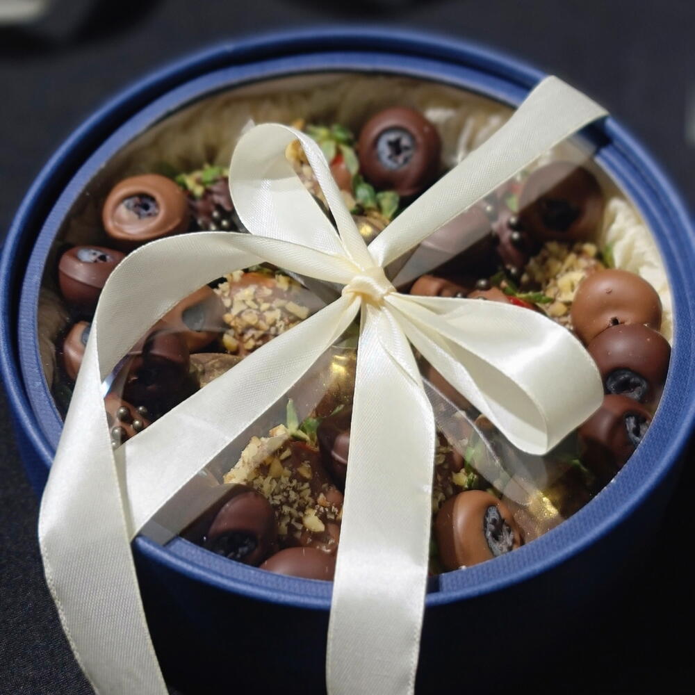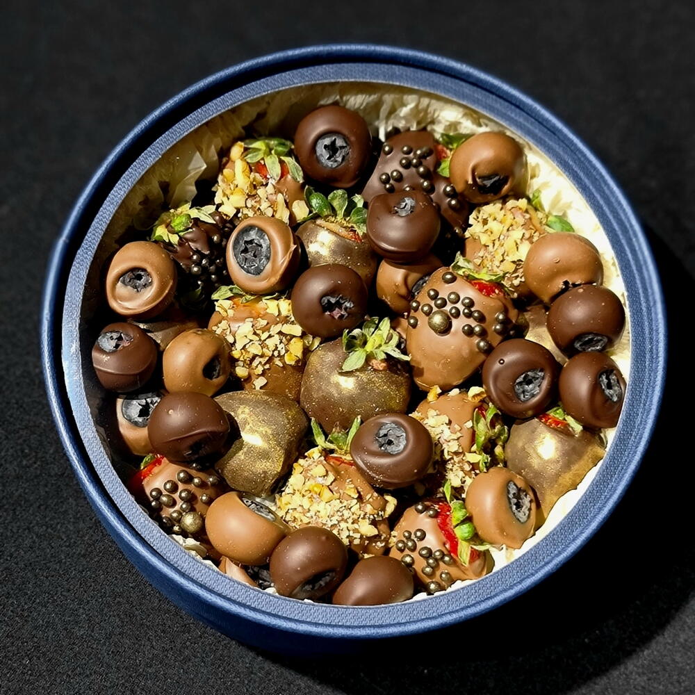 Клубника в молочном бельгийском шоколаде Callebaut, клубника в тёмном бельгийском шоколаде Callebaut, украшенная грецким орехом и воздушным рисом. Голубика в молочном бельгийском шоколаде Callebaut, голубика в темном бельгийском шоколаде Callebaut.