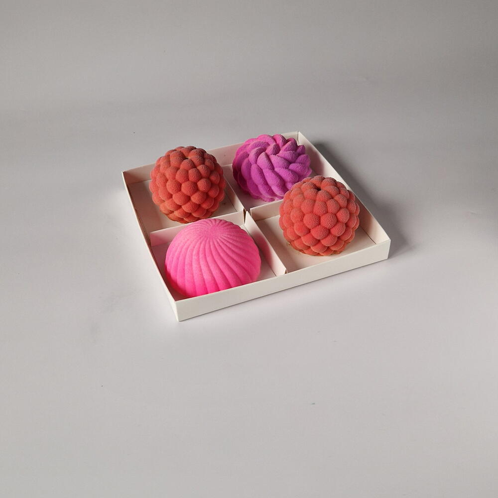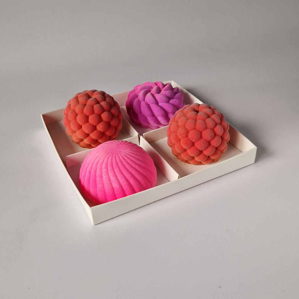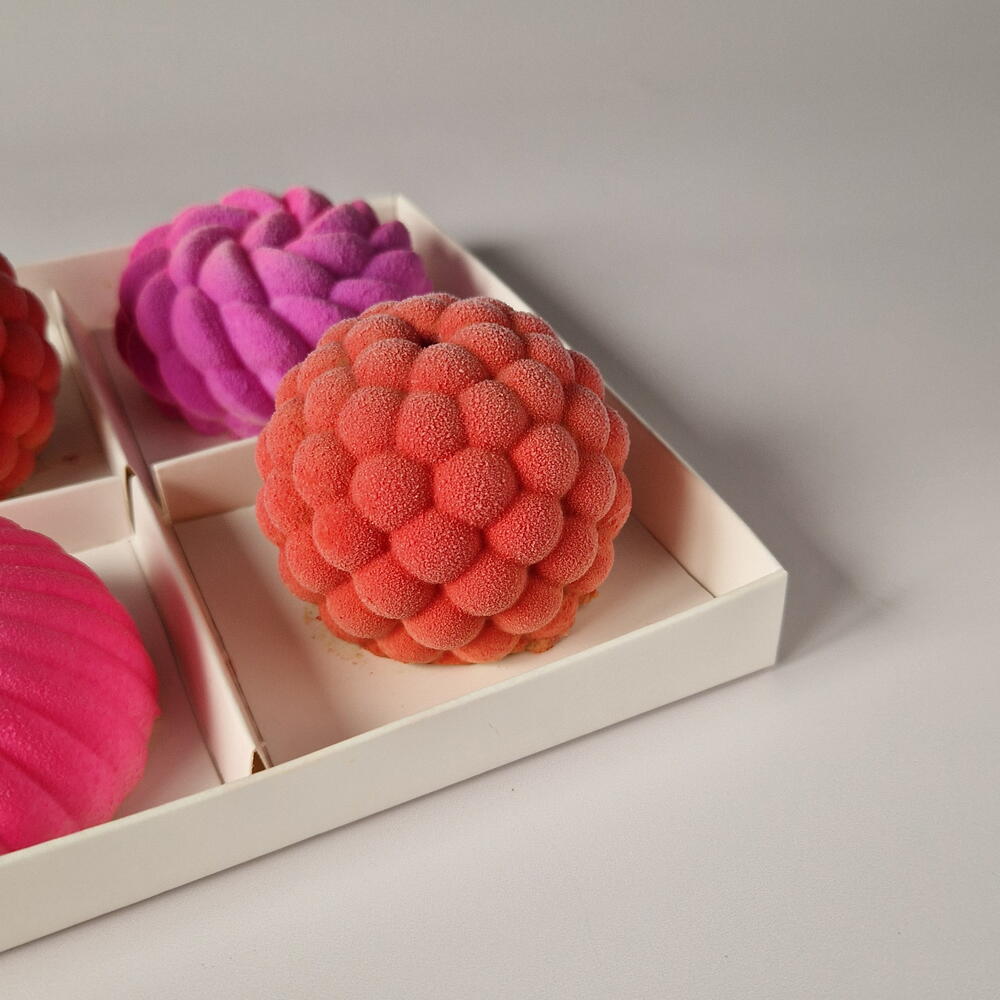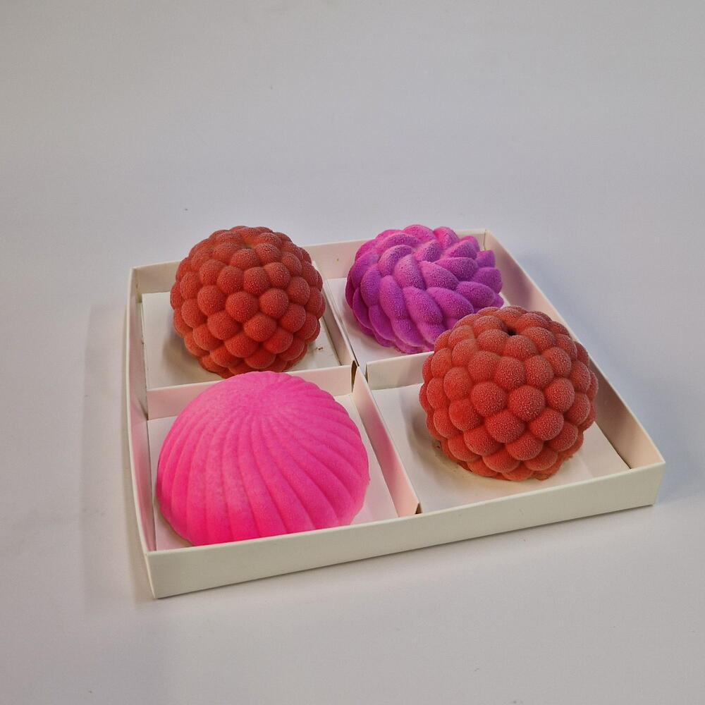 Малина-фисташка муссовый 3 шт: 1. Малиновый крем 2. Малиновое желе 3. Миндальный бисквит с фисташковой пастой 4. Мусс фисташковый с белым шоколадом. Состав: пюре малины, фисташковая паста, белый шоколад, мука, миндальная мука, сахар, яйца, сливки, глюкозный сироп, пектин, желатин говяжий. Малиновый йогурт: Малиновое желе Миндальный бисквит Малиновый пунш Хрустящий слой с шоколадом и сублимииованной малиной Йогуртовый мусс Состав: греческий йогурт, белый шоколад, сливки 33%, мука, миндальная мука, сублимированная малина, вафельная крошка, масло 82%, пюре малины, желатин, пектин NH.