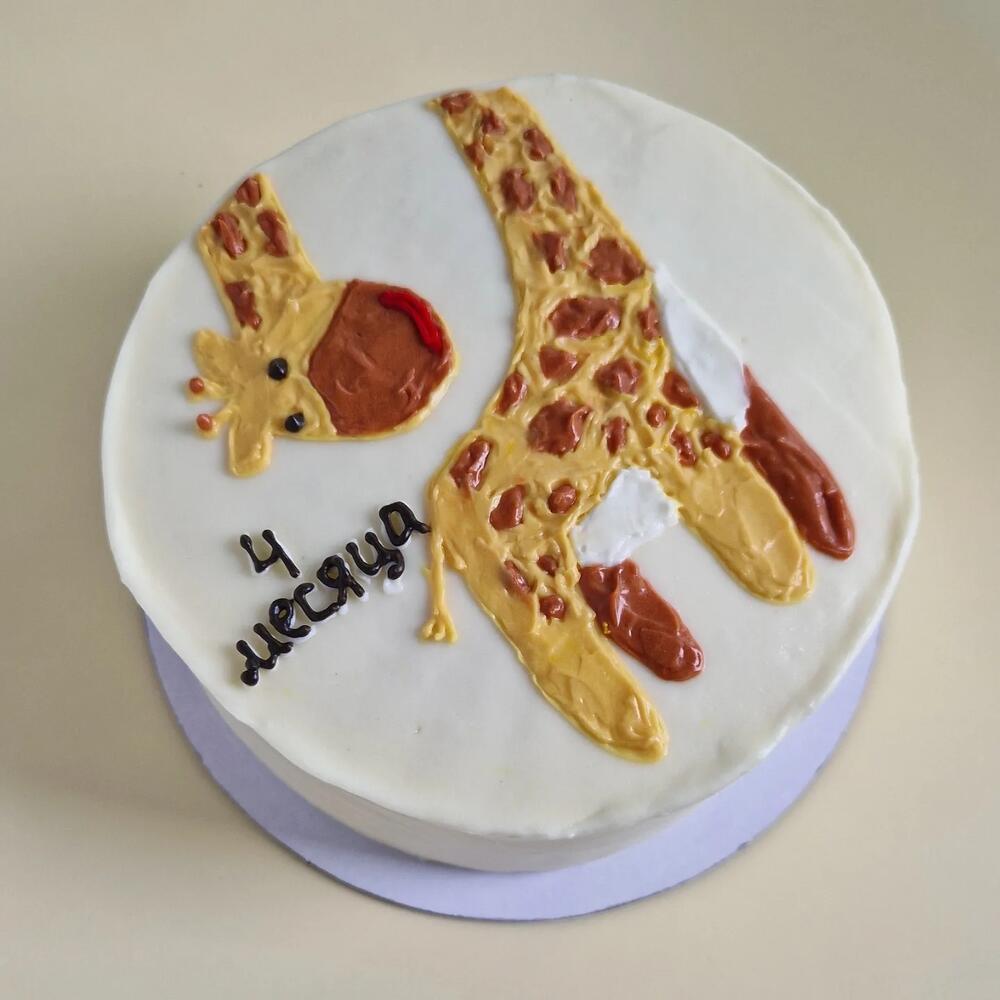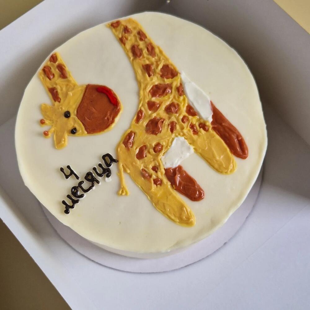 Детский торт с жирафом. Сбалансированный вкус, не приторный. Без добавления красителей (только в креме на рисунке). Натуральные ингредиенты. Товар необходимо хранить в холодильнике не более 72 часов.