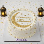 Бенто-торт выполнен в нежном белом цвете, что придаёт ему чистый и элегантный вид. На его поверхности аккуратно нанесена золотистая надпись «Ramadan Mubarak», которая красиво переливается и создаёт праздничный, торжественный эффект. Декор минималистичный: белый крем покрывает весь торт ровным слоем, а тонкие золотые детали подчёркивают надпись, делая бенто изысканным и стильным. Такой торт выглядит празднично, нежно и идеально подходит для подарка или семейного ифтара.