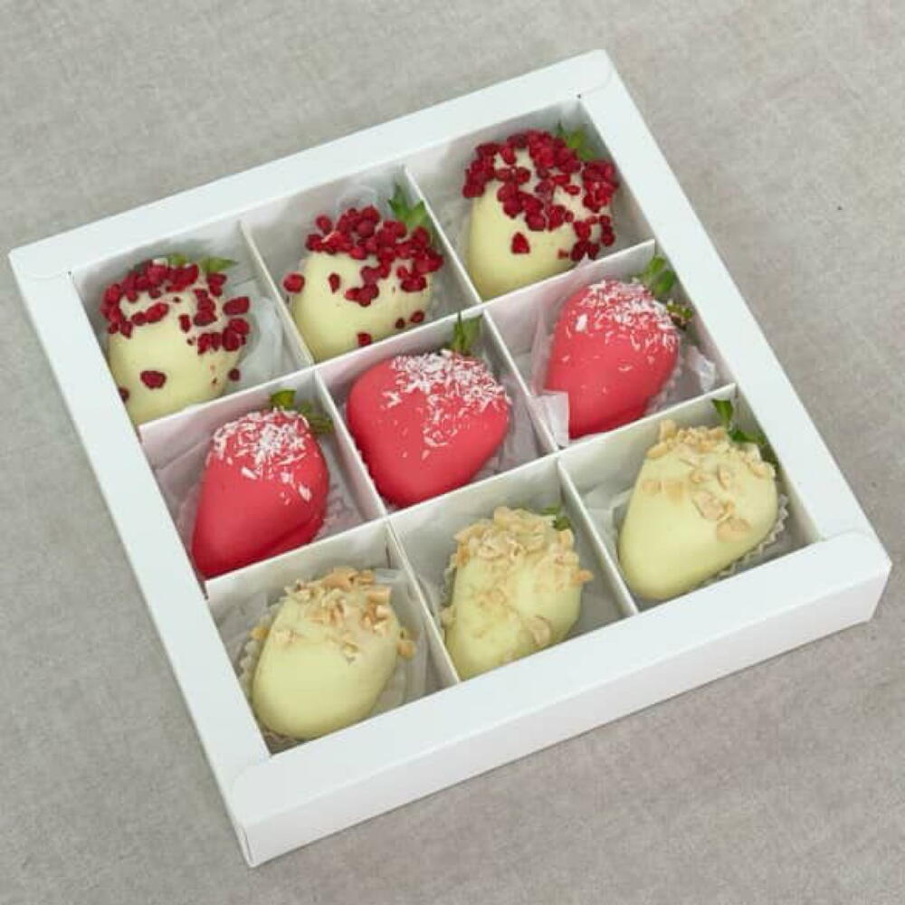 Бокс из 9 свежих ягод клубники, покрытых бельгийским белым и молочным шоколадом, украшенных натуральной клубничной крошкой, кокосовой стружкой и орехами. Каждая ягода расположена в отдельной ячейке стильной подарочной коробки, что делает этот набор идеальным для подарка или приятного угощения на праздник.