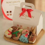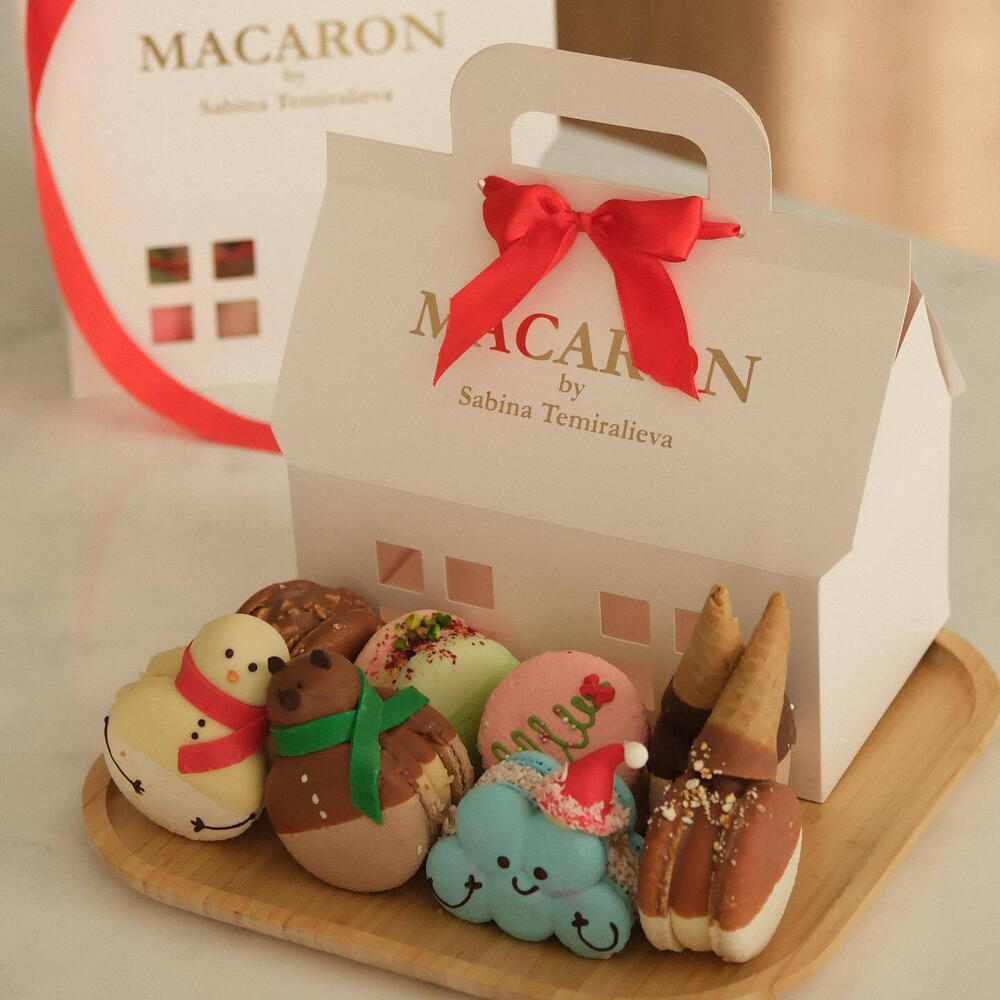 Бокс с новогодними макаронсами — изысканный сладкий набор с праздничным настроением. Нежные макаронс с хрустящей оболочкой и воздушной начинкой оформлены в зимней и новогодней стилистике. Такой бокс станет прекрасным подарком, украшением праздничного стола или милым комплиментом в преддверии Нового года.