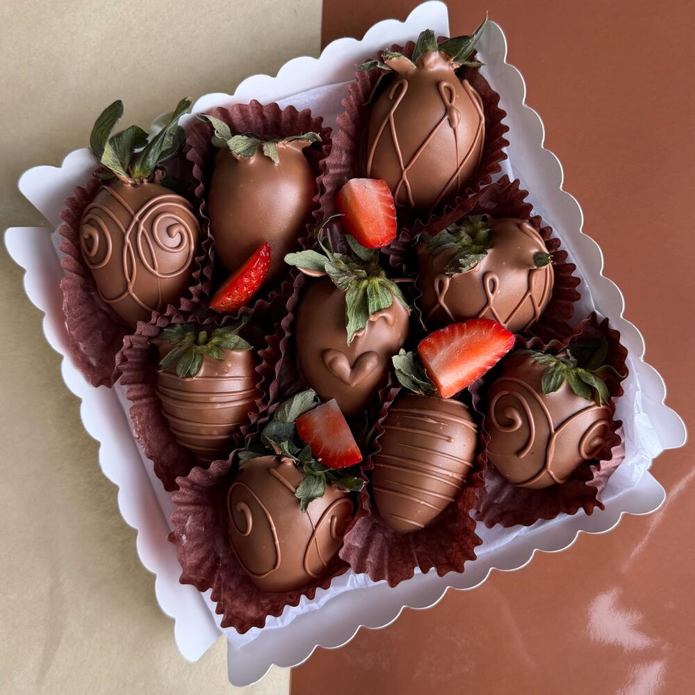 9 ягод в наборе ( отборная свежая клубника) Молочный Бельгийский шоколад Callebaut (сахар, масло какао, сухое цельное молоко, какао тертое, эмульгатор: соевый лецитин) Подарочная коробка с прозрачной крышкой и бантиком