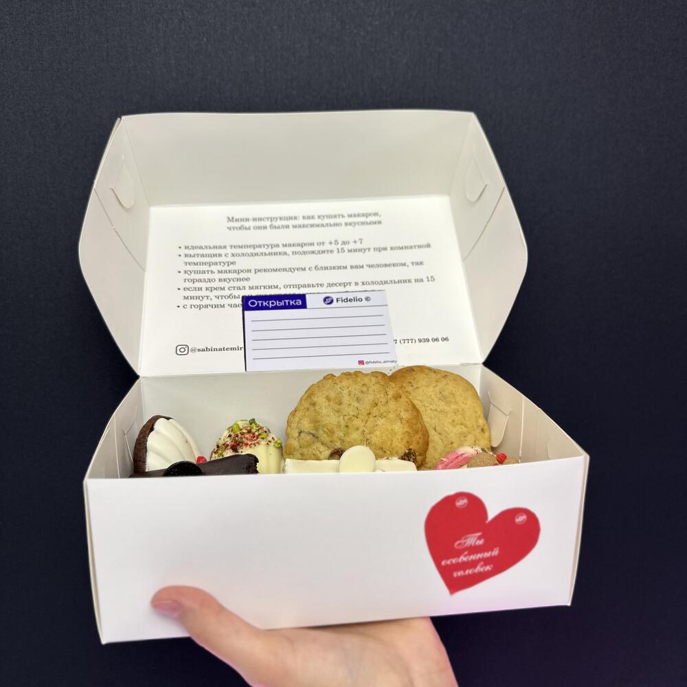 Побалуйте себя и своих близких роскошным ассортиментом сладостей с нашим боксом Mix. Этот изысканный набор включает 2 печенья Chunky с нежными финиками, 4 эксклюзивных пирожных Fidelio, 2 изысканных макаронса и 2 ароматных мадлена. Каждое угощение тщательно подобрано, чтобы создать гармоничное сочетание вкусов и текстур, делая этот бокс идеальным для особых моментов или как выразительный подарок, упакованный в стильную и элегантную коробку.