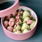 Бокс из клубники в белом и розовом шоколаде, в дополнении с сердцами из шоколада