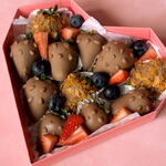 Клубничный сет в форме сердца. Сочетание свежей клубники в бельгийском молочном шоколаде с хрустящим декором из хлопьев и орешков. Лёгкое украшение ягодами клубники и черники придаёт свежесть и праздничное настроение. Идеальный комплимент или подарок для любимых. Каждый сет собирается вручную из свежих ингредиентов, возможны незначительные отличия по оформлению.