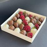 25 шт клубник в молочном и белом шоколаде, украшенных сублимированной малиной и кандурином