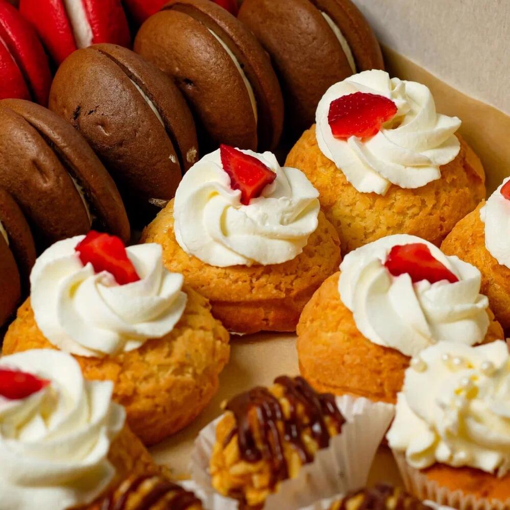 Сет пирожных из 5 разных видов пирожного: Заварное пироженное Шу - 6 шт, пироженое вупипай-6 шт, пирожное красный бархат-6 шт, муравейник с арахисом- 6 шт, лимонные мини капкейки-6 шт.