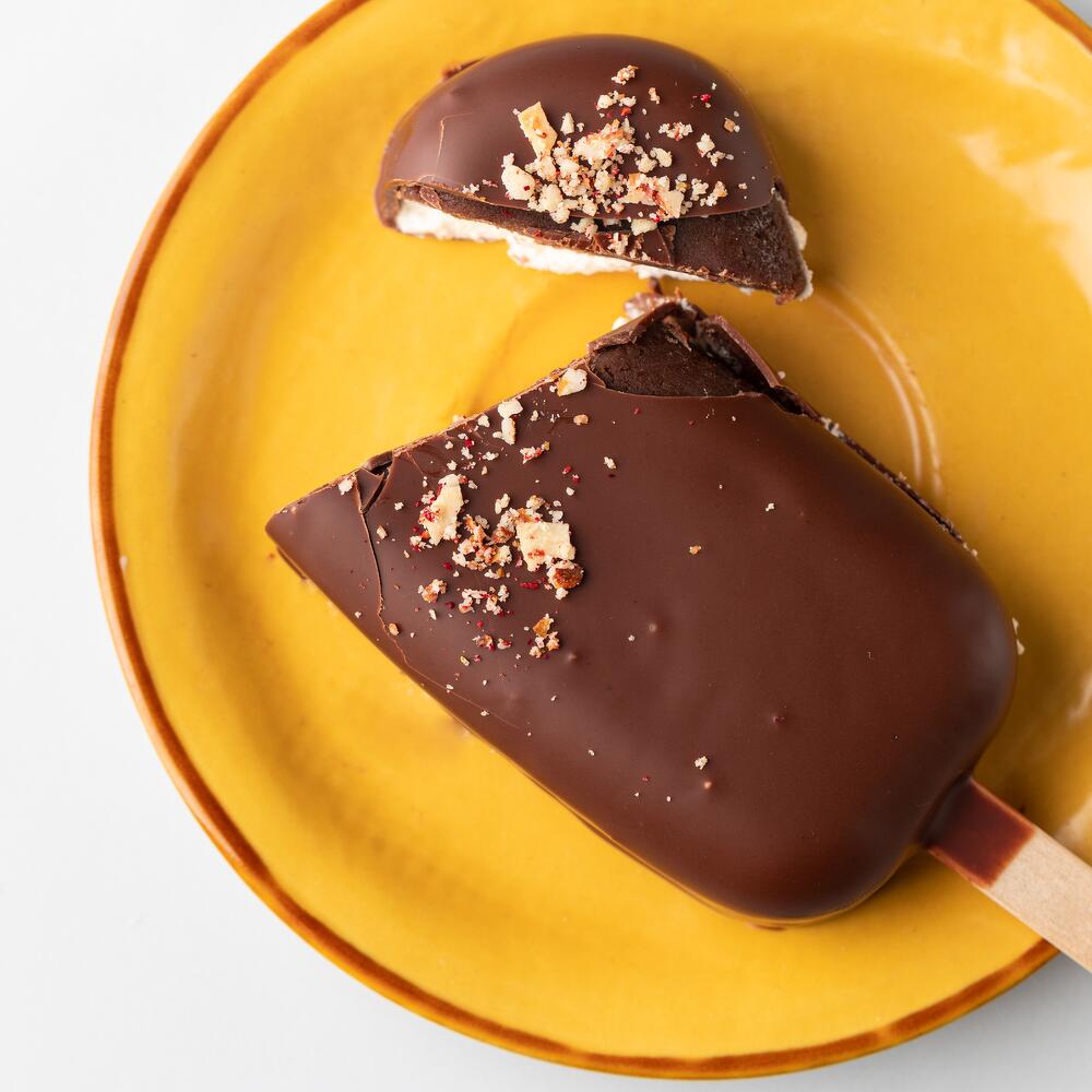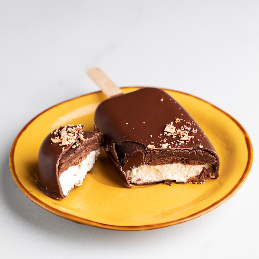 Пирожное в виде мороженого состоящего из нескольких слоев: пирожное картошка, шоколадный ганаш, карамель, взбитые сливки.