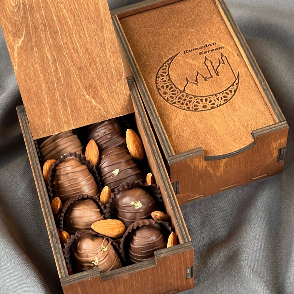 Королевские финики в бельгийском премиум шоколаде с начинкой из орехов. Стильный подарок в богатом оформлении на Рамадан!