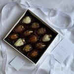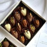Королевские финики Medjoul в бельгийском шоколаде callebaut 12 шт. Начинки - кешью орехи + белый шоколад - фундук + молочный шоколад - фисташки+ фисташковая паста+ молочный шоколад - орех пекан+молочный шоколад - арахисовая паста + молочный шоколад с арахисовой крошкой
