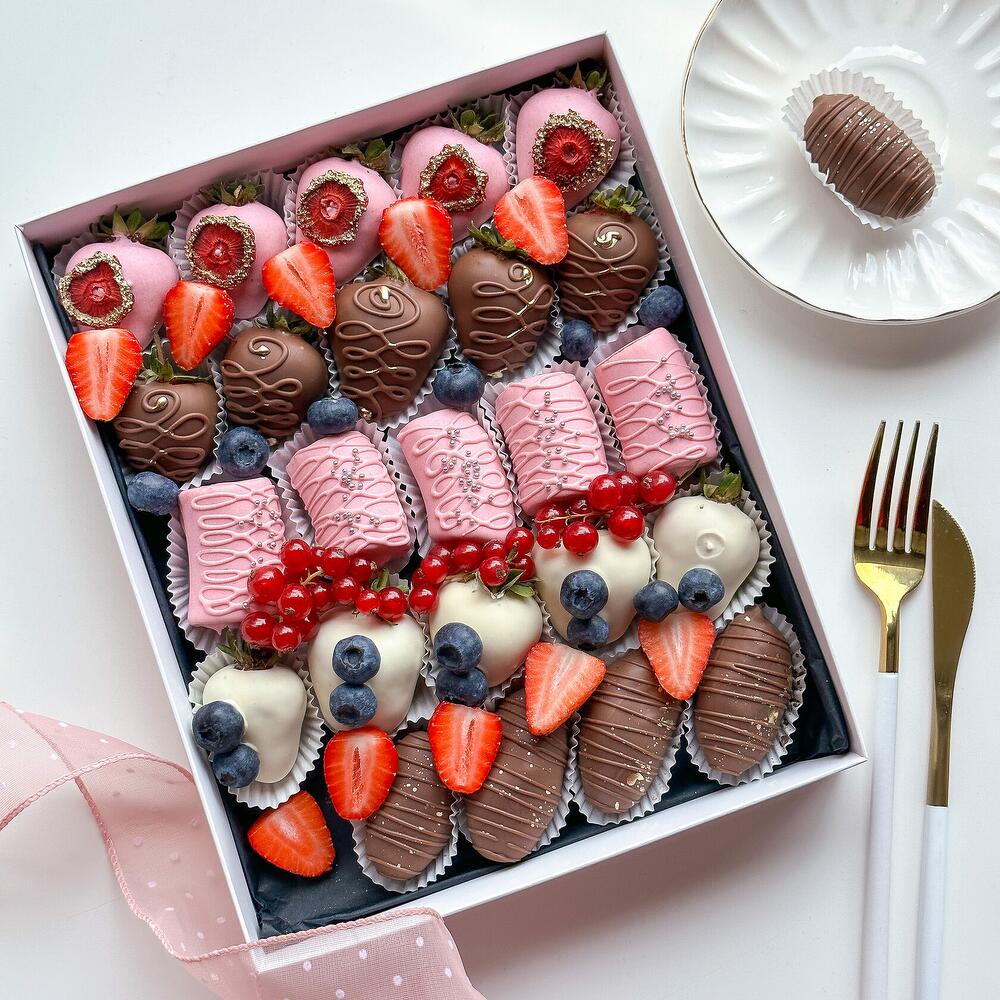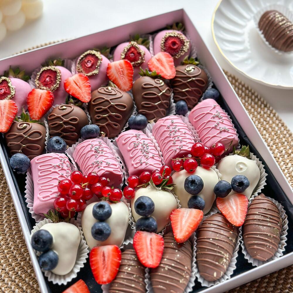 Чудесный бокс из клубник, бананов и фиников в шоколаде, украшенный нарезкой из свежей клубникой и голубикой!