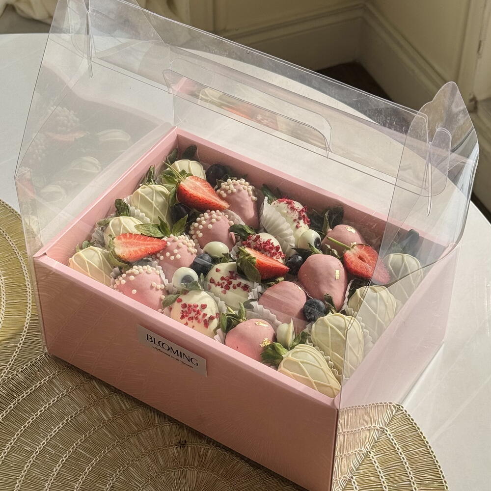 Свежая клубника в трёх видах бельгийского шоколада, украшенная ягодами, жемчугом и золотом. Всё это бережно собрано в пудрово-розовой коробке с прозрачной крышкой. Идеальный подарок для девушки, подруги или мамы — на день рождения, 8 марта или просто, чтобы напомнить: “Ты достойна самого вкусного.”