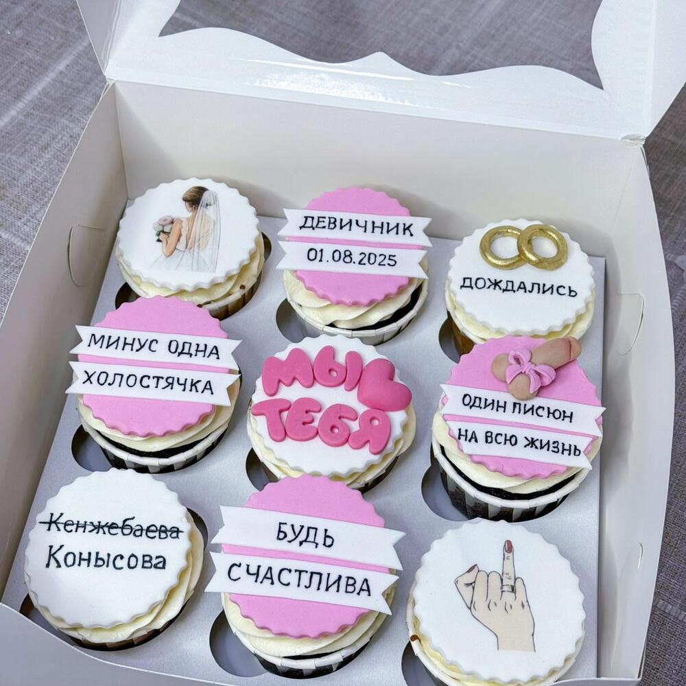 Капкейки на девичник - это не просто десерт, а целая атмосфера праздника! Нежные, стильные, с лёгкой дерзинкой - как и сама невеста 👰♀️✨ Идеальны для съёмки, вечеринки и того самого «девичьего вайба Фамилия, надписи - все может быть заменено под Ваш запрос цена указана за 9 штук