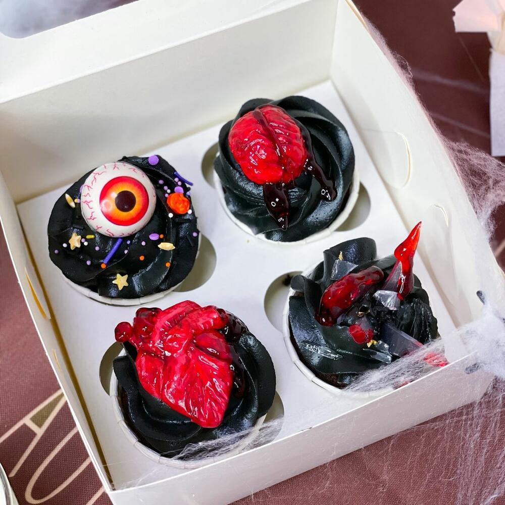 Капкейки на Хэллоуин — немного мрака, немного магии и много вкуса! Сердце, глазки, осколки стекла — всё как положено в ночь, когда можно быть кем угодно Цена указана за 4 штуки