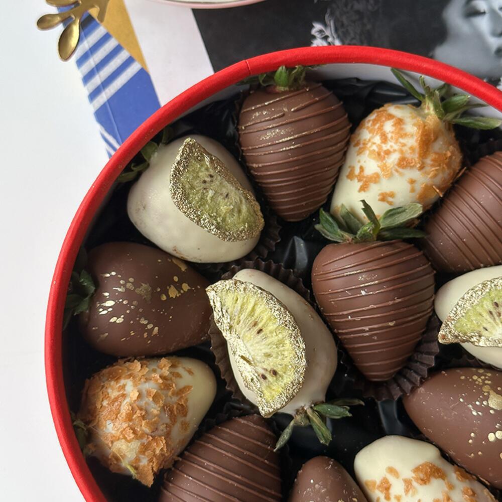 Клубничный бокс "Амаретти" Коробка с клубникой в гармоничном сочетании белого и молочного итальянского шоколада с декором из киви - это десерт, который станет настоящим наслаждением для любителей необычных сладостей.
