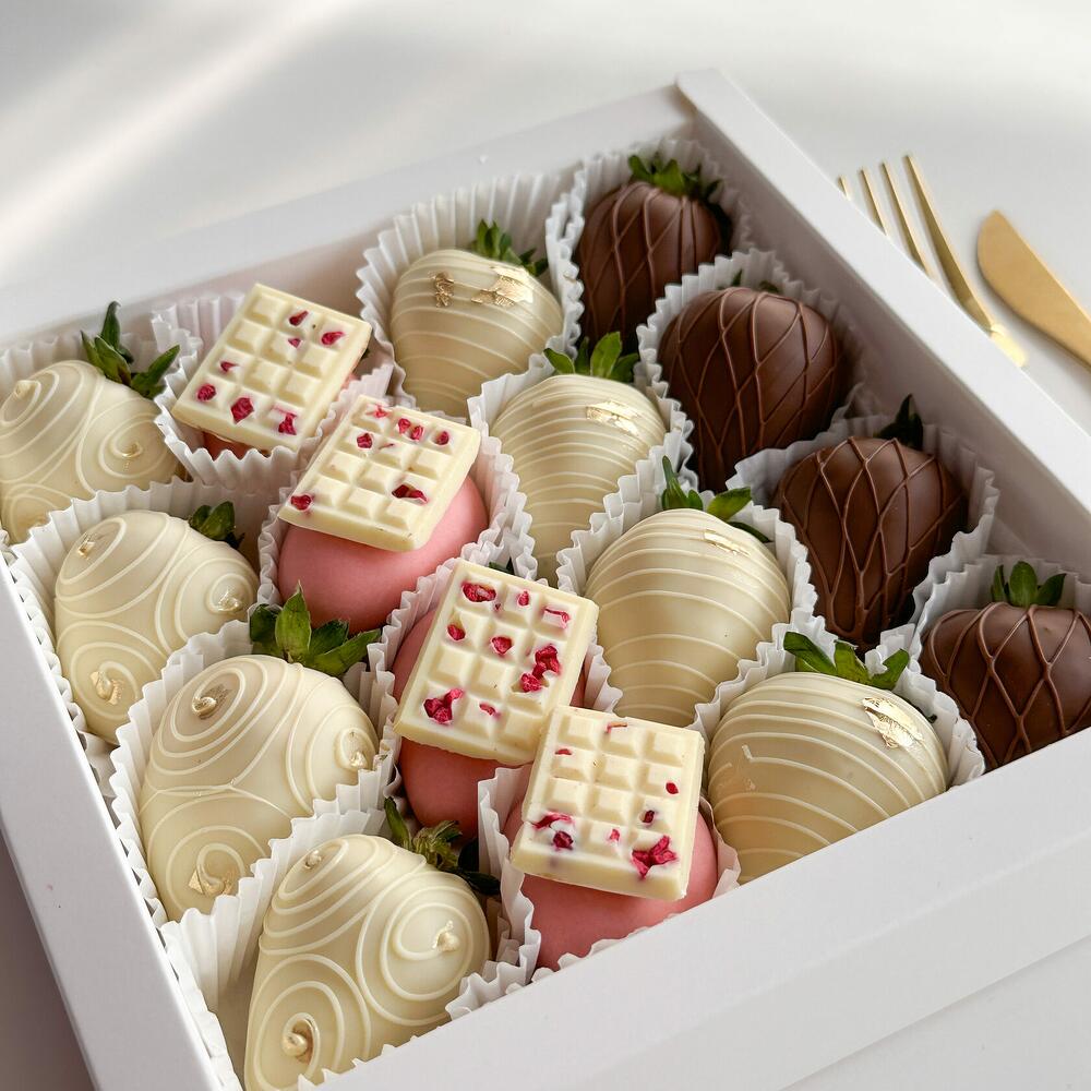 Клубничный бокс «Амазонка» Коробочка с клубникой в итальянском шоколаде с мини-плитками – это настоящее лакомство для гурманов.