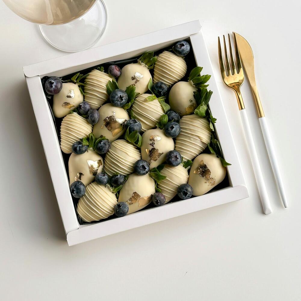 Клубничный бокс «Bride», состоящий из 16 сочных клубник в белом шоколаде в паре с ягодным декором.