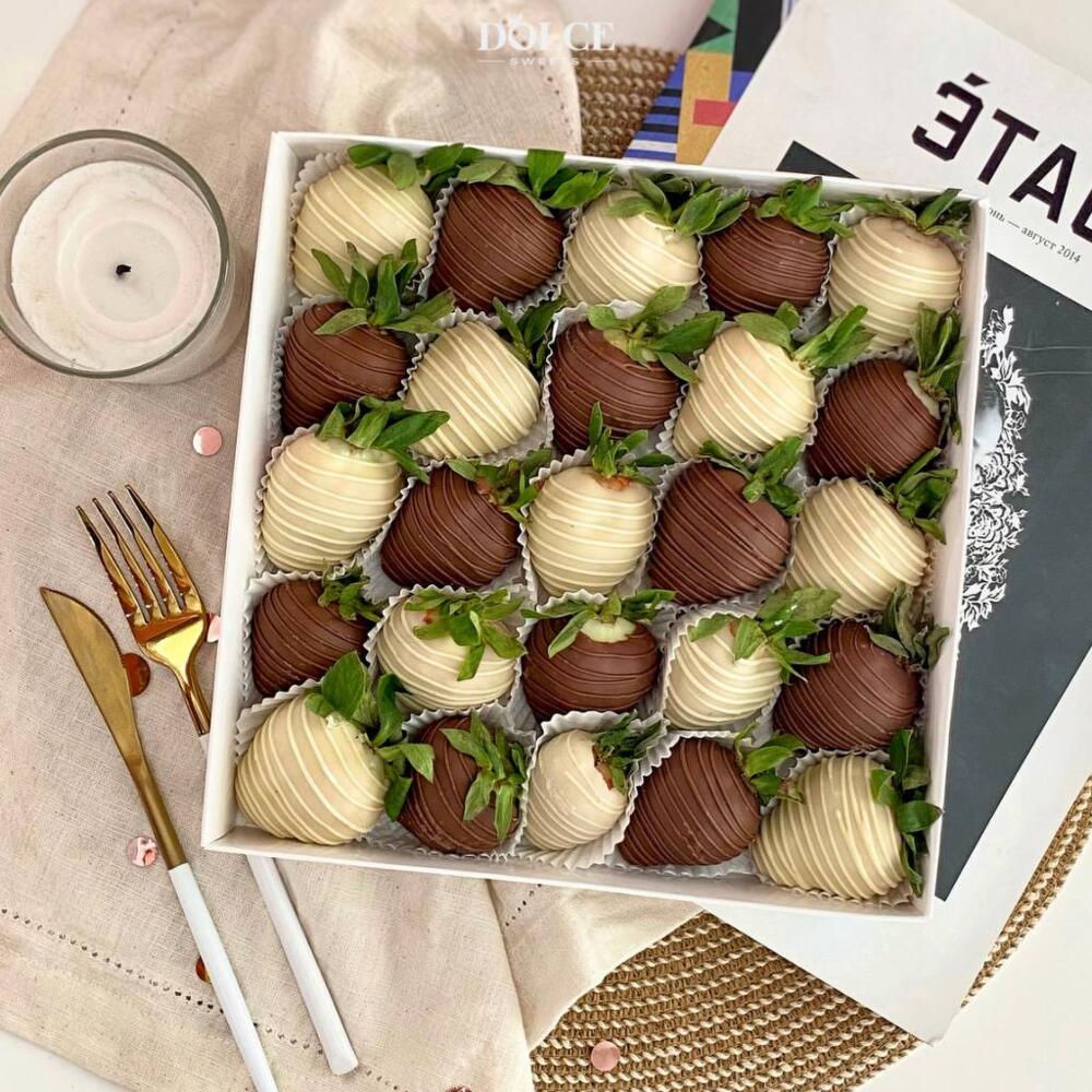 Клубничный бокс «Ладья» в шоколадно-белом оформлении клубники.