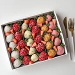 Клубничный бокс "Сладкий ноябрь" Коробка с клубникой в нежном розовом и элегантном белом шоколаде, украшенная ароматной нарезкой из свежайших ягод, представляет собой истинное произведение искусства.