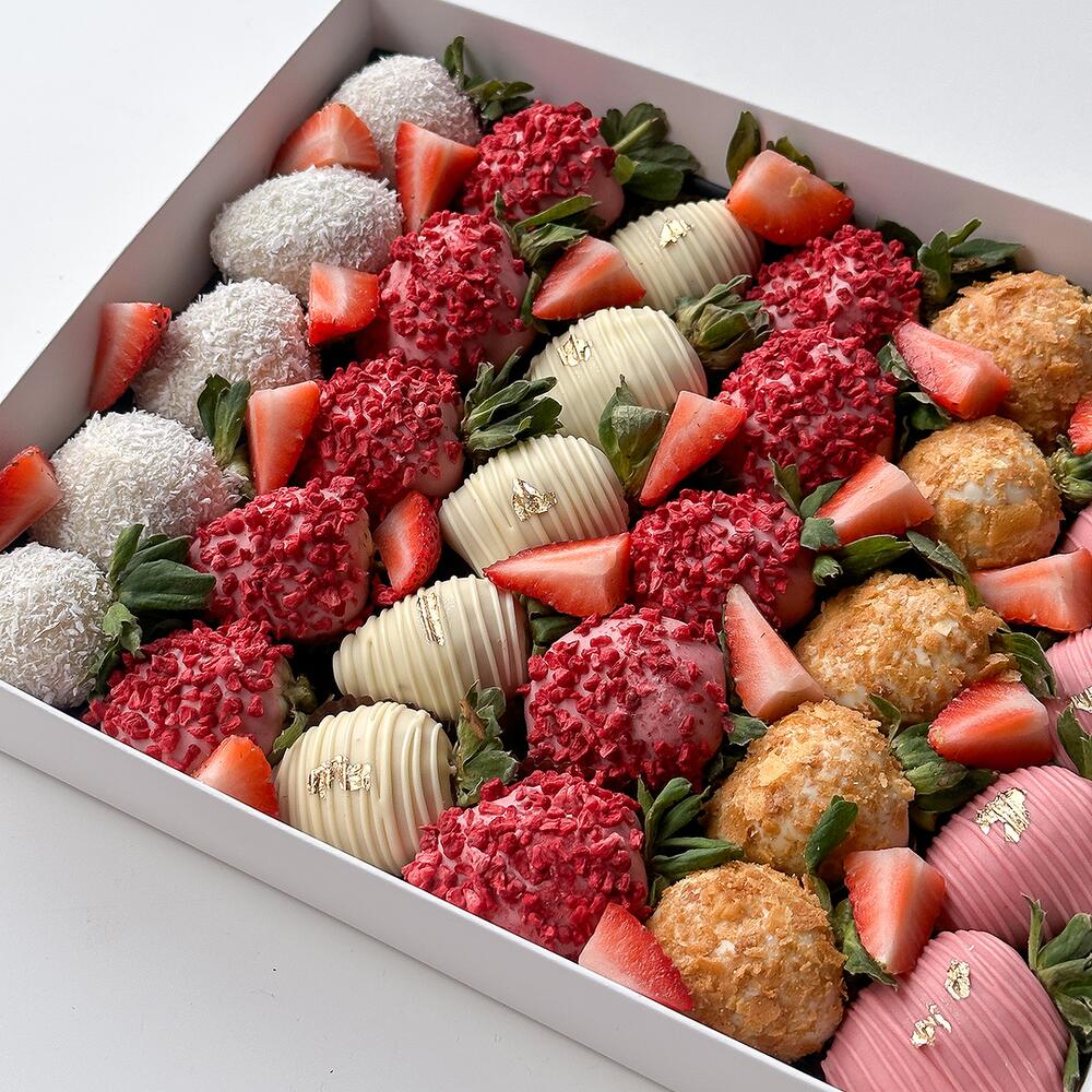 Клубничный бокс "Сладкий ноябрь" Коробка с клубникой в нежном розовом и элегантном белом шоколаде, украшенная ароматной нарезкой из свежайших ягод, представляет собой истинное произведение искусства.