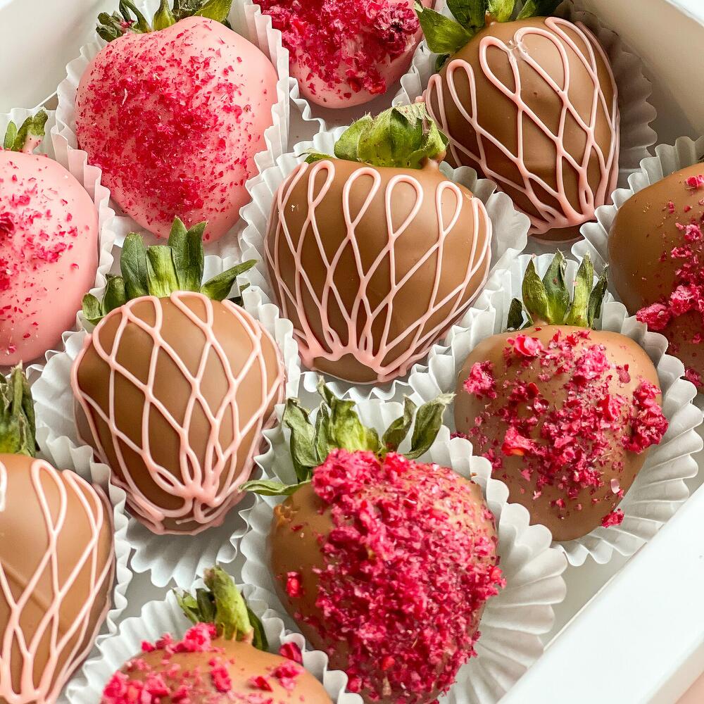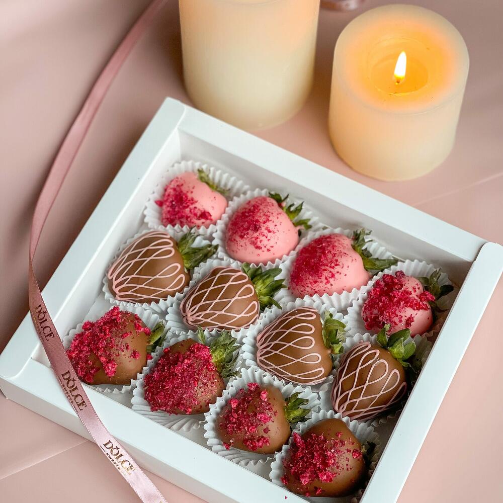 Клубничный бокс "Влюбленность" из клубник в розовом и молочном шоколаде. Декор из сублимата и шоколадных узоров.