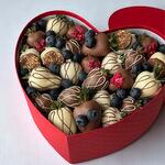 Свежая клубника в белом и молочном шоколаде (какао-бобы, какао-масло, сахар, молоко, лецитин, ароматизаторы), сушенная малина, свежая голубика.