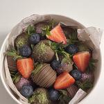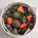 Клубника, бельгийский шоколад молочный(какао-масло, тертое какао, сухое цельное молоко, сахар, натуральные лецитин и ваниль) посыпка фисташковой муки, голубика свежая