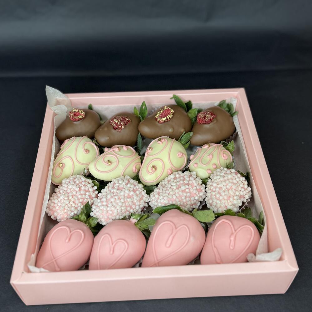 ▎Состав набора: 1. Основной ингредиент:• Свежая крупная клубника (16 шт.) 2. Шоколадная глазурь: • Молочный шоколад • Белый шоколад • Розовый шоколад (белый шоколад с натуральным пищевым красителем или клубничным пюре) Примерный состав шоколада:• Какао-масло • Сухое молоко • Сахар • Какао-порошок (в молочном шоколаде) • Натуральные или идентичные натуральным ароматизаторы • Пищевые красители (для розового шоколада) • Эмульгатор (лецитин) 3. Посыпка и украшение: • Посыпка из сахарных жемчужин • Посыпка из крокант (сахар, рисовые шарики или воздушный рис) • Лиофилизированная клубника (кусочки сушёной клубники) • Декоративные элементы — сердце из шоколада, цветы, кандированная клубника и т.д.