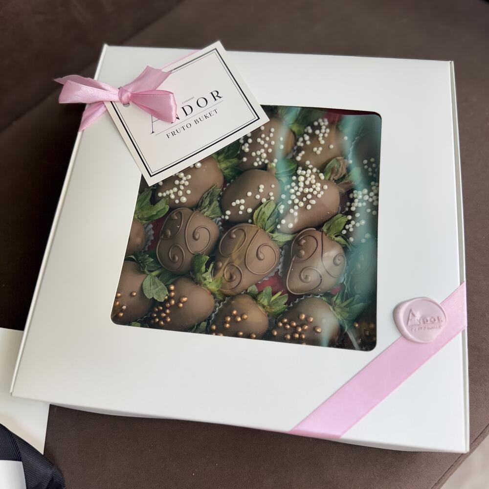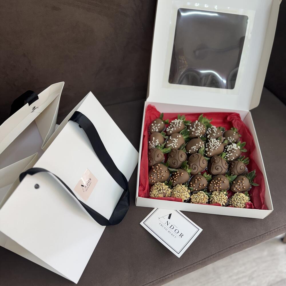 Клубника в шоколаде (25 шт.) Состав товара:• Свежая клубника • Шоколад молочный (или темный — зависит от вашего выбора) • Посыпки: сахарные шарики, дроблёный миндаль Состав шоколада:Молочный шоколад:• Сахар • Какао-масло • Сухое молоко • Какао тёртое • Эмульгатор: соевый лецитин • Ванильный ароматизатор Темный шоколад (по желанию):• Какао тёртое • Сахар • Какао-масло • Эмульгатор: соевый лецитин • Ванильный ароматизатор Посыпка:• Сахарные декоративные шарики • Дроблёный миндаль или подсушенный орех • По желанию: кокосовая стружка, цветной сахар (возможны варианты по согласованию)