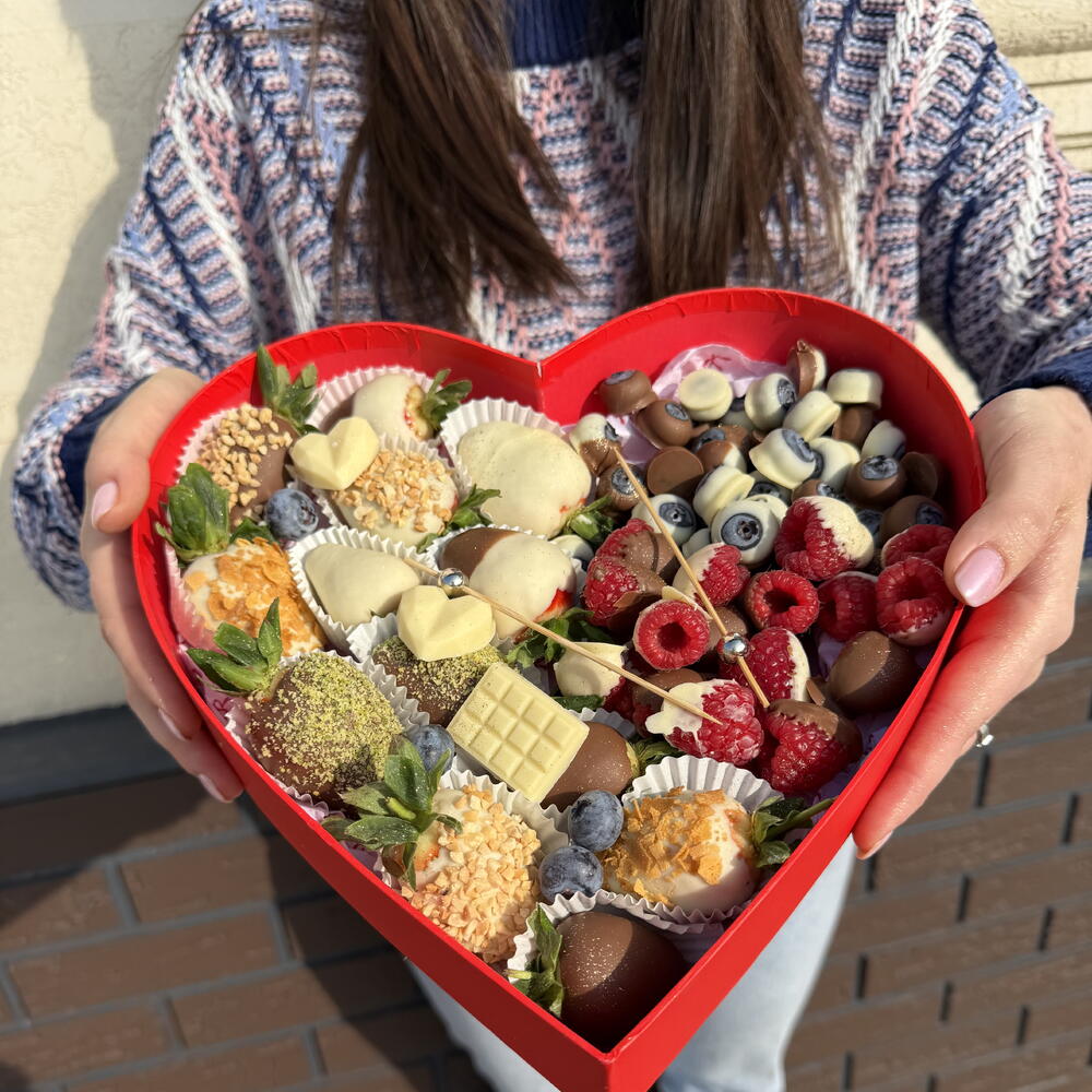 1. Клубника свежая 2. Голубика свежая 3. Малина свежая 4. Шоколад: - Белый шоколад: Сахар, сухое цельное молоко, какао-масло, эмульгатор (лецитин), натуральный ванилин. • Молочный шоколад: Сахар, какао-масло, какао тертое, сухое молоко, сухая сыворотка, эмульгатор (лецитин), ванилин. 5. Посыпка: - Вафельная крошка - Дробленый арахис - Фисташка дробленая