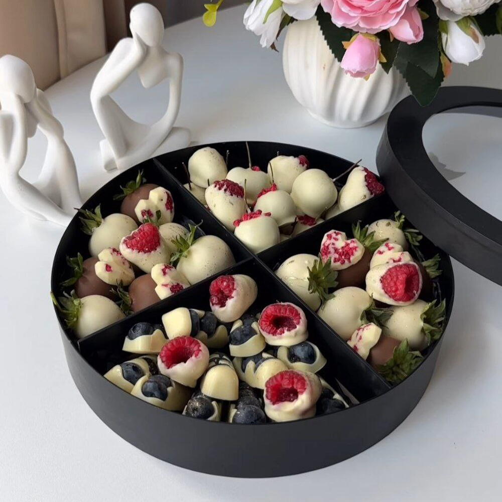 Фирменное ассорти свежих ягод от Sweet Realm, покрытых бельгийским белым и молочным шоколадом. В наборе — клубника, малина и голубика, аккуратно разложенные по секциям в стильной круглой коробке. Идеальный подарок для любого повода — красиво, вкусно и эффектно.