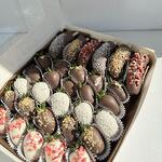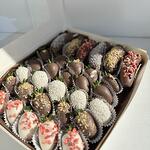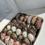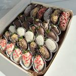 Клубника в белом и молочном бельгийском шоколаде - 25 шт (1200 грамм) Бананы в шоколаде - 6 шт(600 грамм) Посыпки: арахисовая, кокосовая (50 грамм) Состав шоколада: какао-масло, тертое какао, сухое цельное молоко, сахар, натуральные лецитин и ваниль