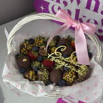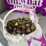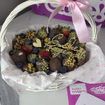 Бельгийский шоколад (какао-тертое, какао-масло и сахар. В молочном и белом шоколаде также присутствуют сухое молоко или сухая молочная сыворотка. В качестве добавок используются соевый лецитин (эмульгатор) и натуральный ароматизатор (обычно ваниль)) , клубника свежая, манго сублимат, фисташка дробленная, голубика, съедобное золото .