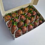 Состав: клубника свежая импортная, шоколад белый и молочный бельгийский, какао тертое, какао масло, сухое молоко, посыпки сахарные. Используется исключительно качественный бельгийский шоколад.