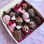 Состав:свежая клубника в бельгийском белом и молочном шоколаде - 12 шт, сублимированная малина, кокос, маршмеллоу Состав шоколада: какао-масло, тертое какао, сухое цельное молоко, сахар, натуральные лецитин и ваниль