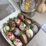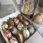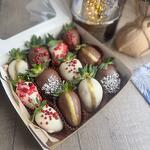 Клубника в белом и молочном бельгийском шоколаде - 12 шт (600 грамм) Посыпка: сублимированной ягодой и кокосовой стружкой (50 грамм) Состав шоколада: какао-масло, тертое какао, сухое цельное молоко, сахар, натуральные лецитин и ваниль