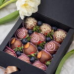 1. Клубника свежая 2. Голубика свежая 3. Шоколад: - Белый шоколад: Сахар, сухое цельное молоко, какао-масло, эмульгатор (лецитин), натуральный ванилин. • Молочный шоколад: Сахар, какао-масло, какао тертое, сухое молоко, сухая сыворотка, эмульгатор (лецитин), ванилин. 4. Посыпка: - Кокосовая стружка - Миндаль обжаренный