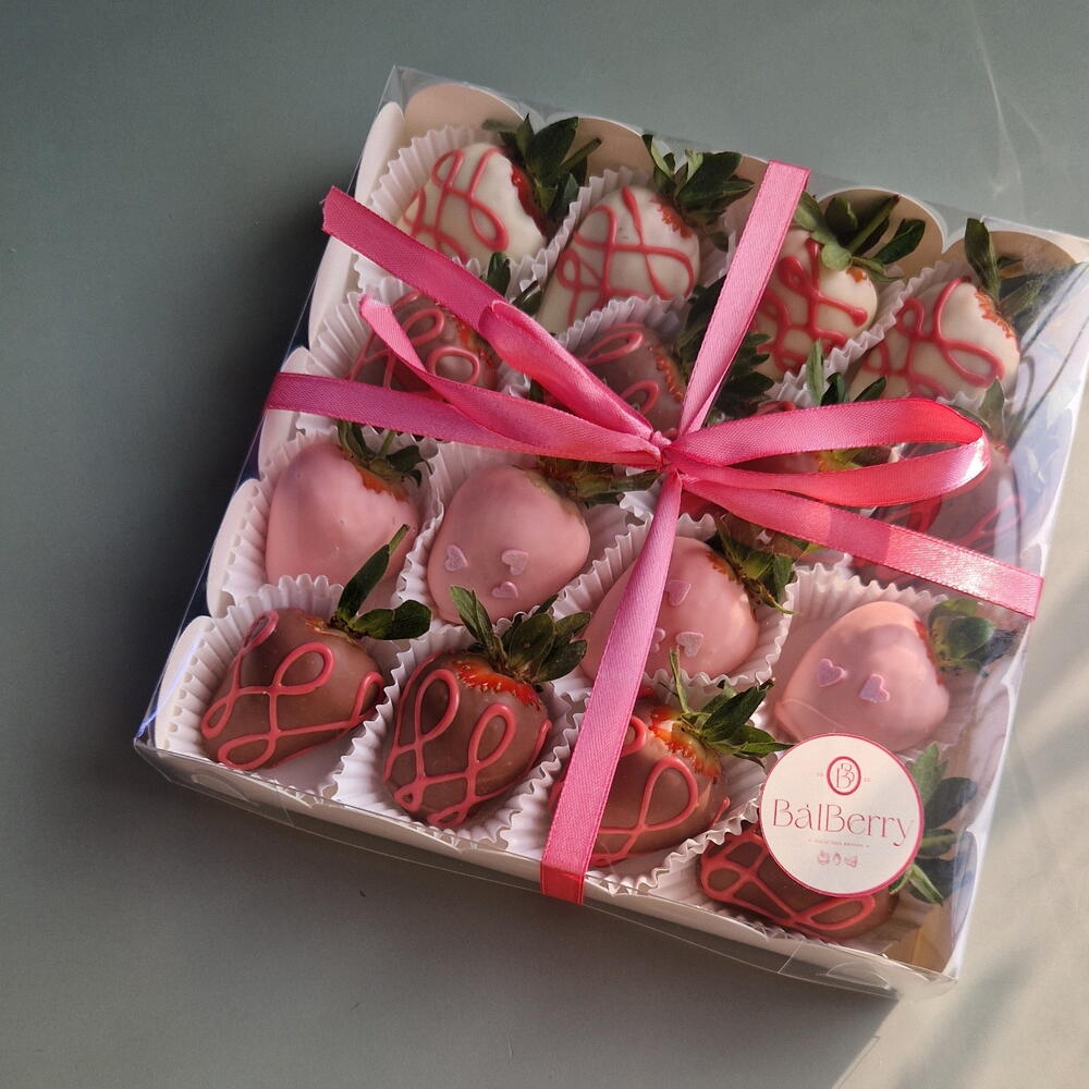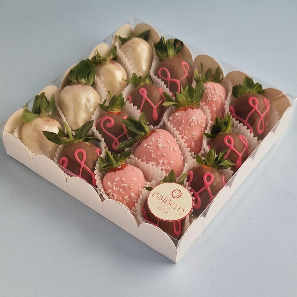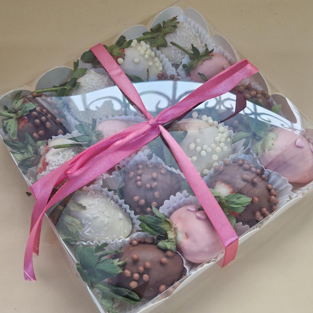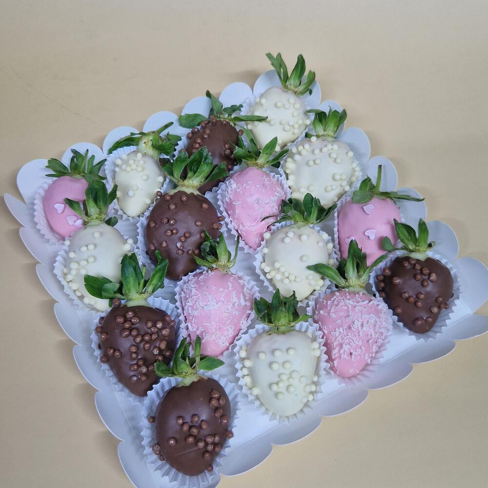 Клубника свежая, шоколад белый бельгийский, шоколад молочный бельгийский. Украшен посыпками. В количестве 16 шт.