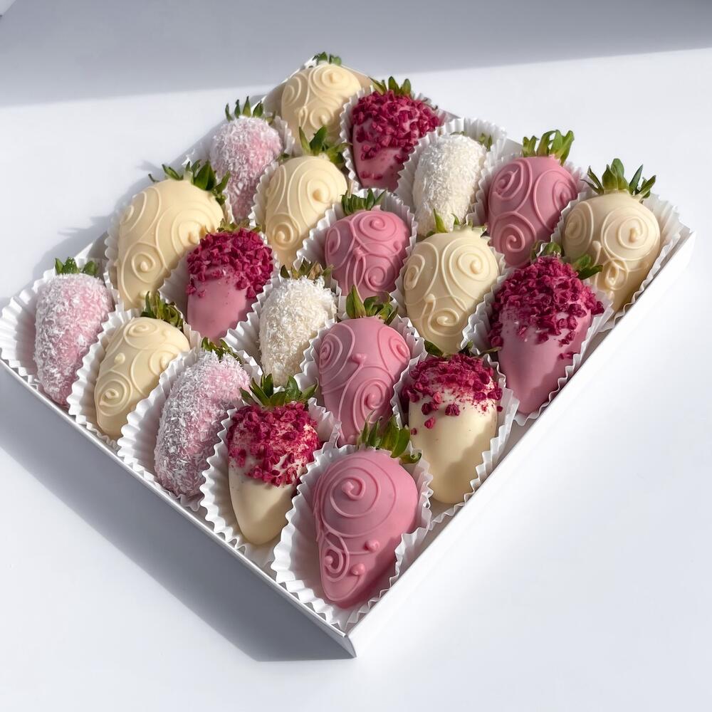 Свежая клубника 20 шт Сублимированная малина Кокосовая стружка Бельгийский шоколад Callebaut (сахар, масло какао, сухое цельное молоко, какао тертое, эмульгатор соевый лецитин, ароматизатор натуральный ваниль) Упаковка: коробка подарочная лента атласная, пакет.