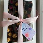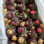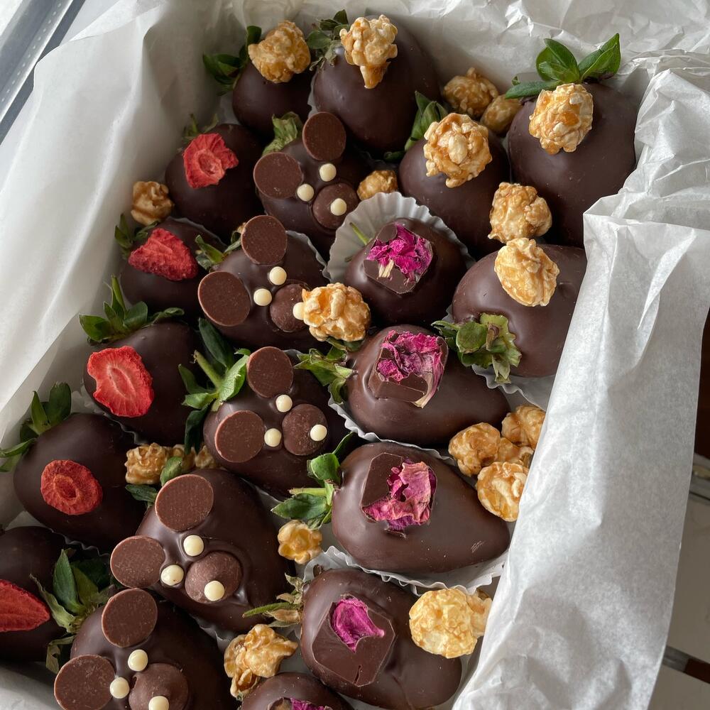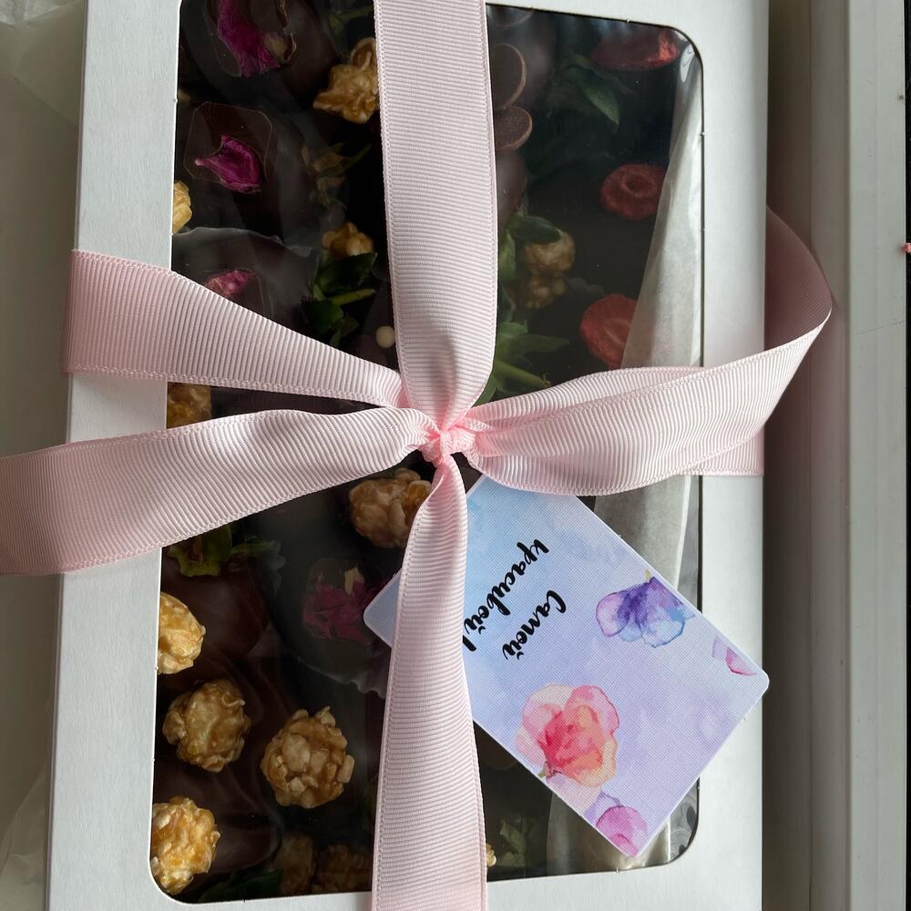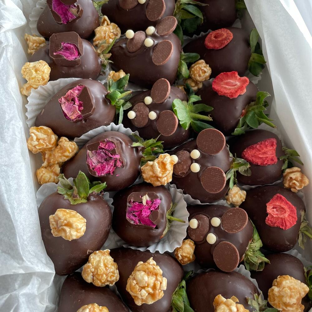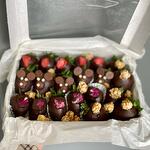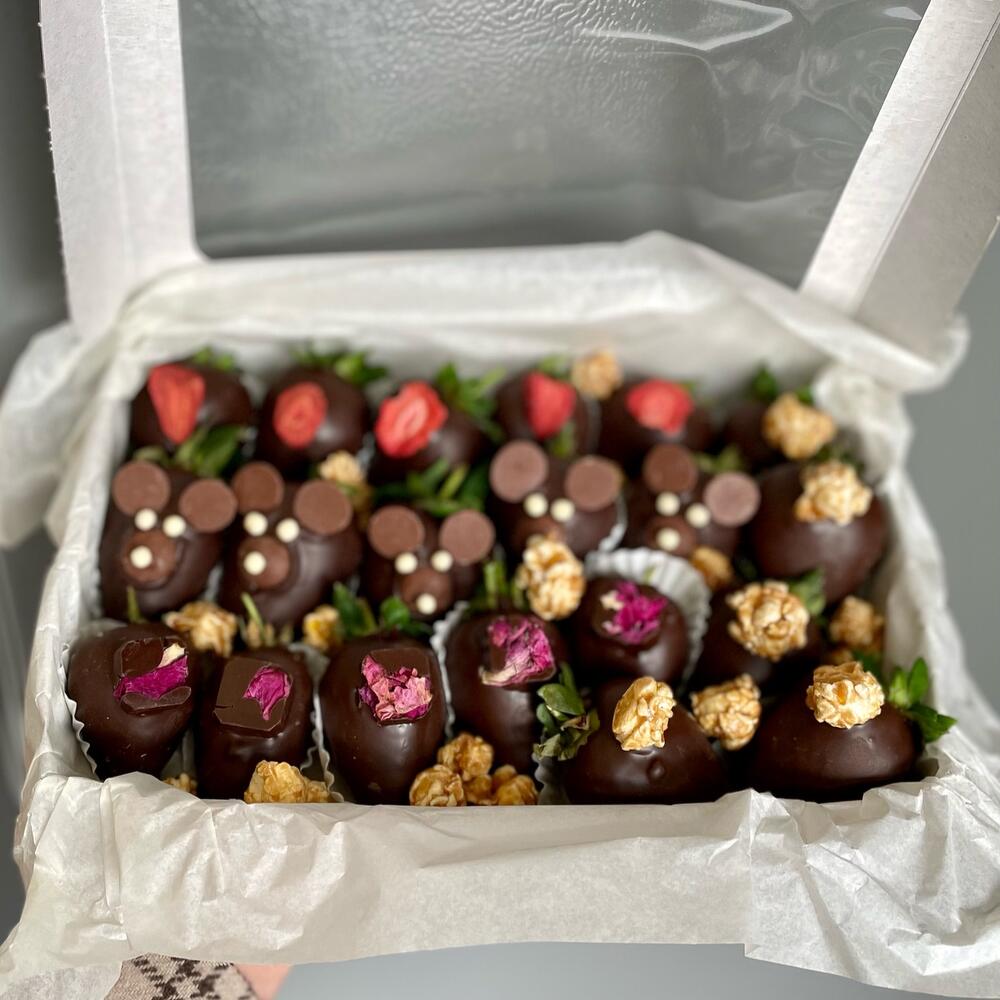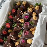 Свежая клубника , молочный бельгийский шоколад, попкорн, сублимированная клубника