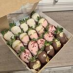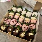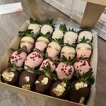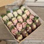 Клубника в белом и молочном бельгийском шоколаде - 20 шт(550 грамм) Посыпки: кокосовая стружка, сусальное золото (50 грамм) Состав шоколада какао-масло, тертое какао, сухое цельное молоко, сахар, натуральные лецитин и ваниль