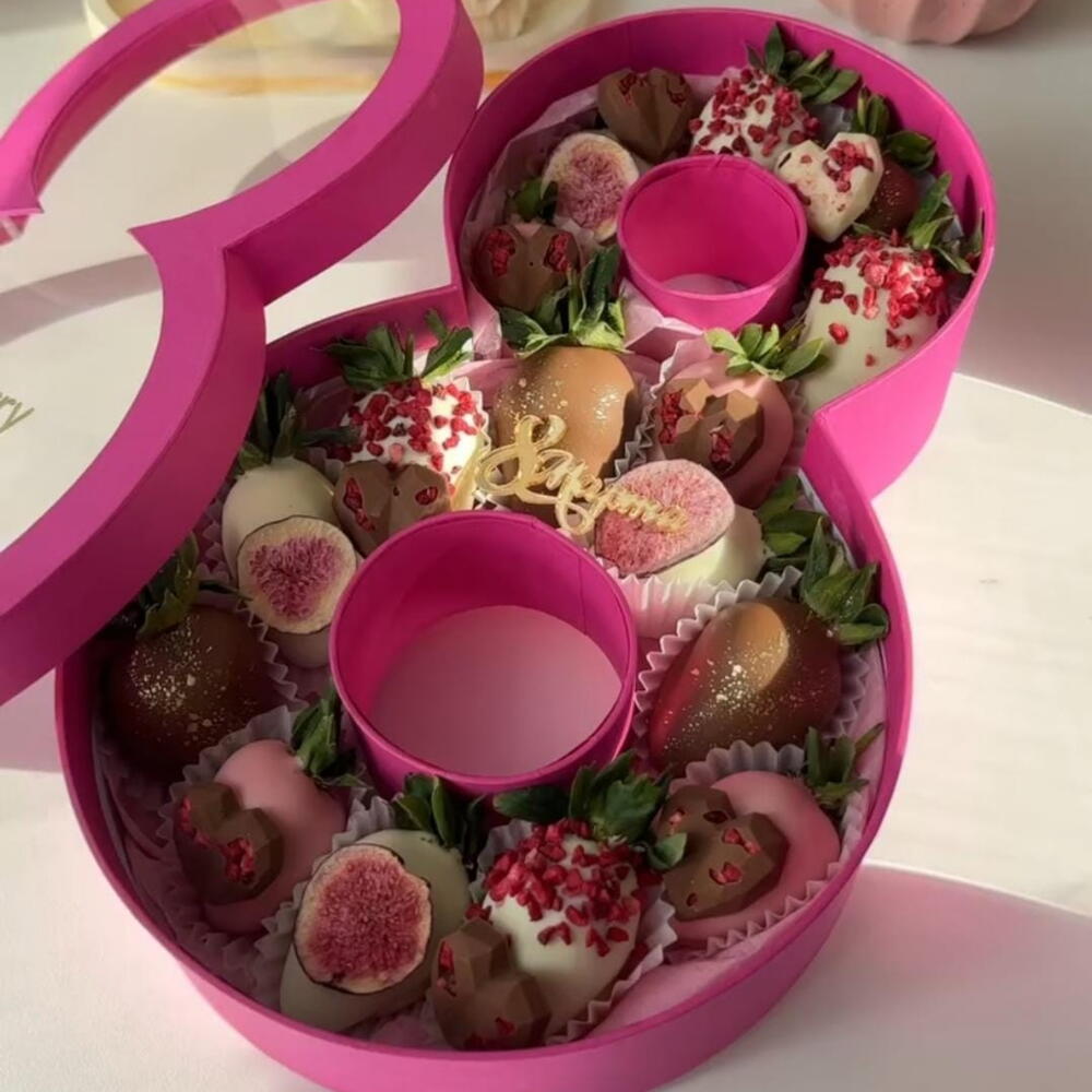 Подарочная коробка в форме цифры «8» — эффектный и стильный комплимент к 8 марта. Свежая отборная клубника покрыта молочным, белым и розовым шоколадом, дополнена сублимированной малиной, инжиром и шоколадными конфетами. Идеальный вариант для мамы, жены, девушки или коллеги — нежно, вкусно и запоминающе. Изготавливаем в день заказа. Без заморозки и консервантов. Изделие выполнено вручную, поэтому допускаются минимальные особенности текстуры и декора. Это подтверждает ручную работу и не влияет на качество и вкус.