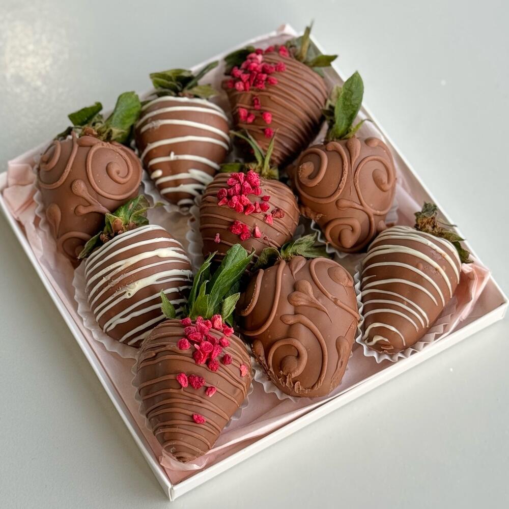 9 ягод в наборе ( отборная свежая клубника) Молочный Бельгийский шоколад Callebaut (сахар, масло какао, сухое цельное молоко, какао тертое, эмульгатор: соевый лецитин) Подарочная коробка с прозрачной крышкой и бантиком
