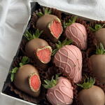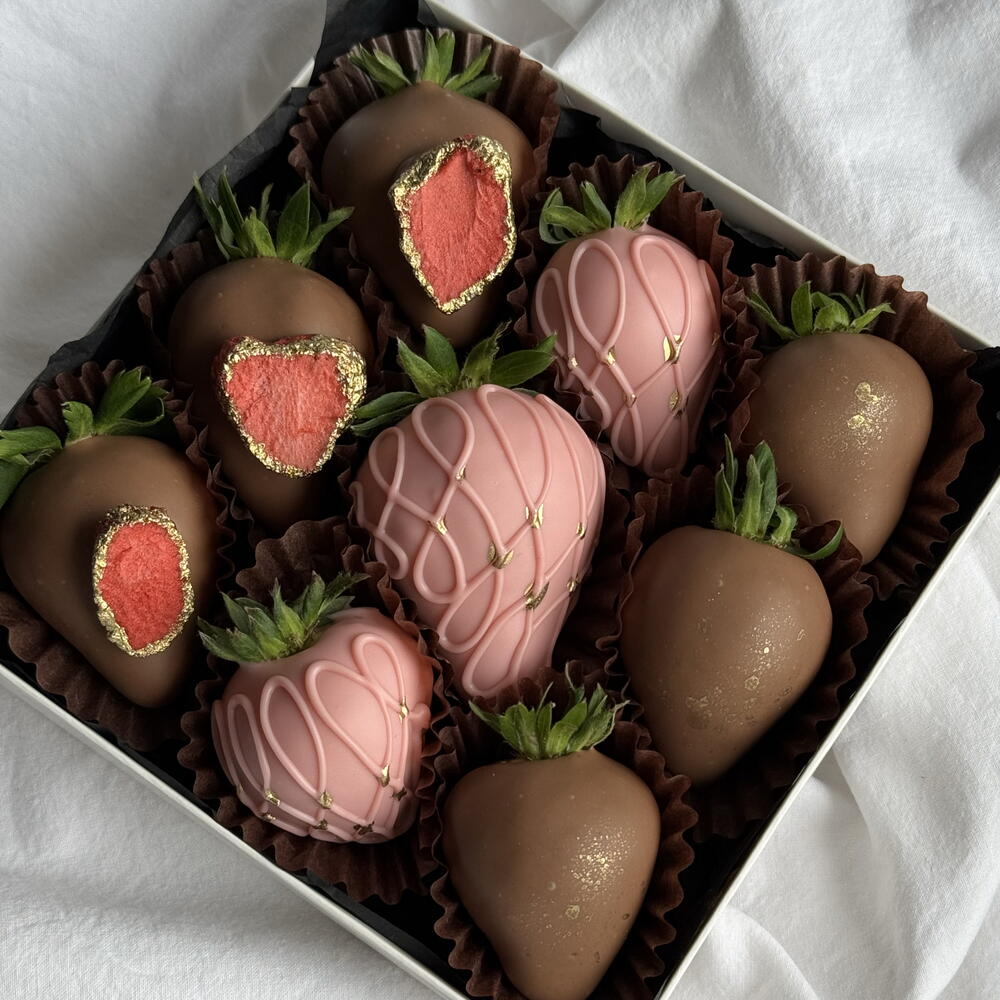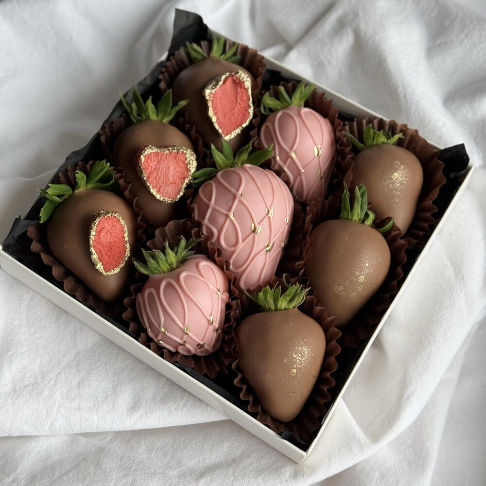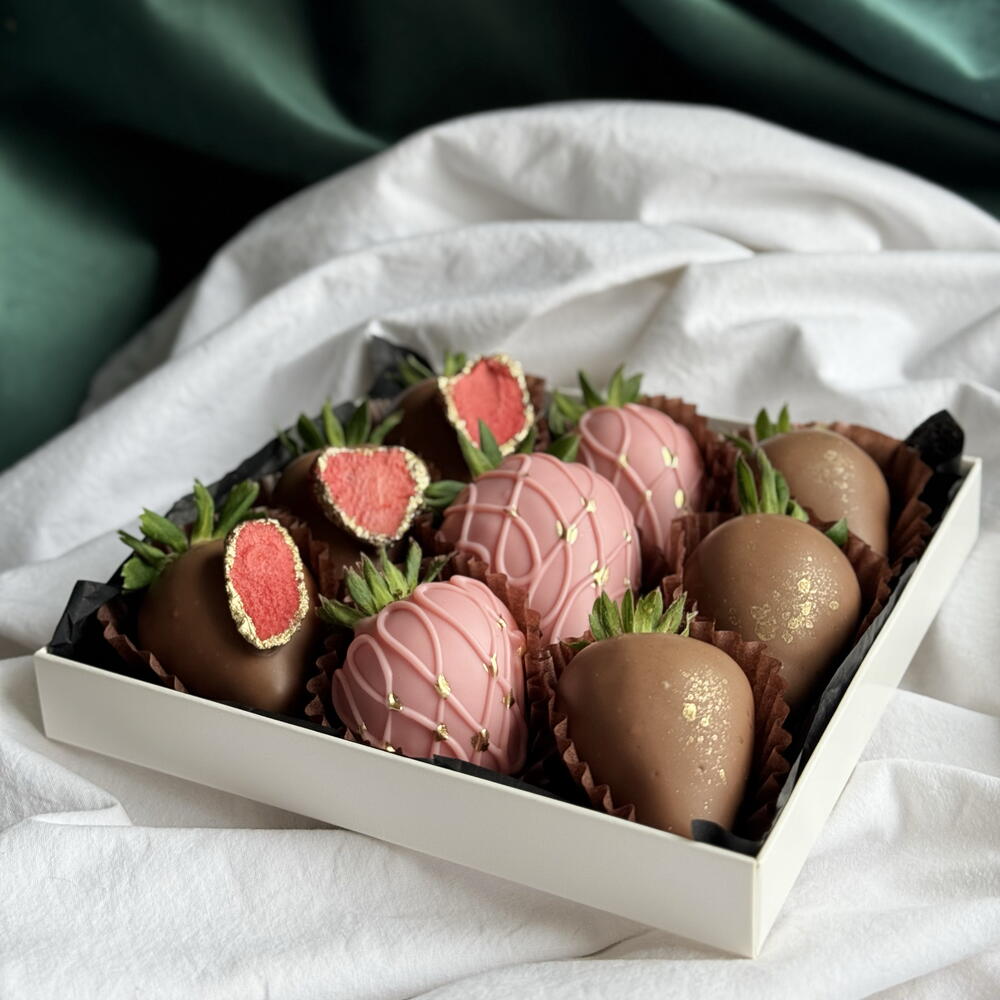 Коробочка AMORE — это сочная отборная клубника в настоящем бельгийском шоколаде Callebaut. Внутри — два вкуса: нежный розовый клубничный и классический молочный. Сверху — хрустящая сублимированная клубника и деликатное кондитерское золото. Идеальный сладкий комплимент, который влюбляет с первого кусочка. 🍓✨
