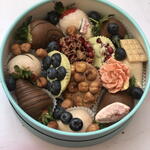 1. Клубника свежая 2. Голубика свежая 3. Гранат свежий 4. Фундук 5. Шоколад: - Белый шоколад: Сахар, сухое цельное молоко, какао-масло, эмульгатор (лецитин), натуральный ванилин. • Молочный шоколад: Сахар, какао-масло, какао тертое, сухое молоко, сухая сыворотка, эмульгатор (лецитин), ванилин.